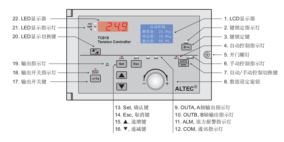 • 當(dāng)控制器工作在自動(dòng)控制模式時(shí),自動(dòng)控制指示燈AUTO)點(diǎn)亮,可旋轉(zhuǎn)數(shù)值設(shè)定旋鈕或按遞增鍵/遞減鍵修改張力設(shè)定值,按AUTO/MAN鍵可切換到手動(dòng)控制模式。