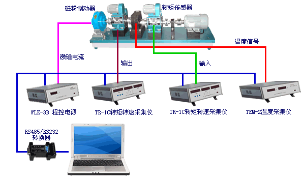 1. 傳動機械測量系統(tǒng)通過2臺相位差式轉(zhuǎn)矩轉(zhuǎn)速傳感器及2臺TR-1C轉(zhuǎn)矩轉(zhuǎn)速采集儀采集變速箱的輸入(輸出)轉(zhuǎn)矩和轉(zhuǎn)速;用1臺TEM-2溫度采集儀采集溫升;用WLK-3B程控電源控制磁粉制動器對變速箱進行加載。
