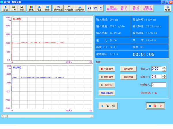 2. 所有儀器通過RS485總線與電腦連接,實現(xiàn)對變速箱的自動加載以及對數(shù)據(jù)的集中采集。實時顯示各參數(shù)與時間之間的關(guān)系曲線,以記錄整過測試過程。