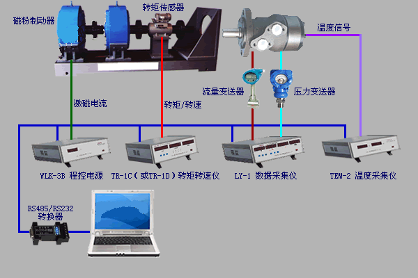 1. 系統(tǒng)通過1臺相位差式轉(zhuǎn)矩轉(zhuǎn)速傳感器及1臺TR-1C轉(zhuǎn)矩轉(zhuǎn)速采集儀(或TR-1D轉(zhuǎn)矩轉(zhuǎn)速采集儀)采集馬達的輸出轉(zhuǎn)矩和轉(zhuǎn)速;用1臺LY-1型數(shù)據(jù)采集儀采集流量和壓力;用1臺TEM-2溫度采集儀檢測溫升;用WLK-3B程控電源控制磁粉制動器對馬達進行加載。